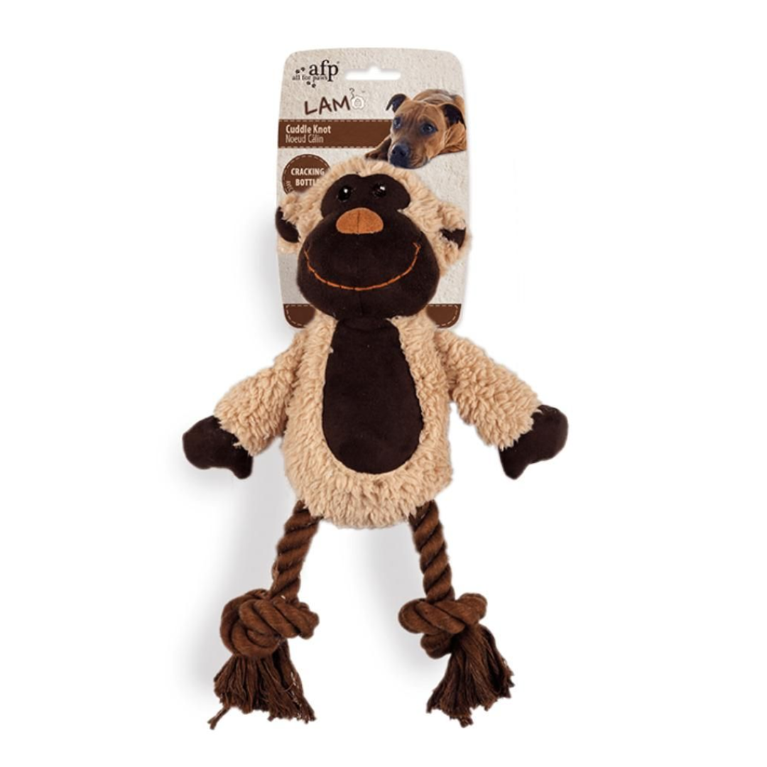 Lam Dog Cuddle Knotted Rope af mærket All For Paws. Søde plysdyr med reb og knitrelyd.