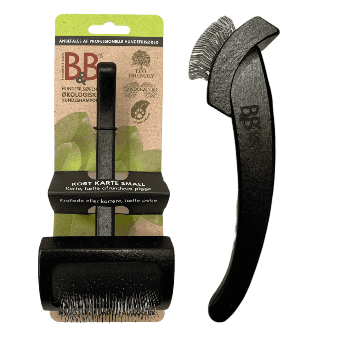 B&B ´s faste, luksuriøse karte med korte, vinklede og tætte afrundede pigge. Den unikke udformning, længde, tæthed og vinkling af piggene på 40 grader, gør den særdeles effektiv til udstrækning af krøllede pelse, som F.eks Puddel, Bichon frisé, spansk vandhund, lagotto Romagnolo, Doodle mm. samtidigt med at den er perfekt til at fjerne underuld på kortere, tætte pelse.