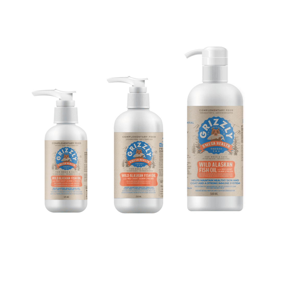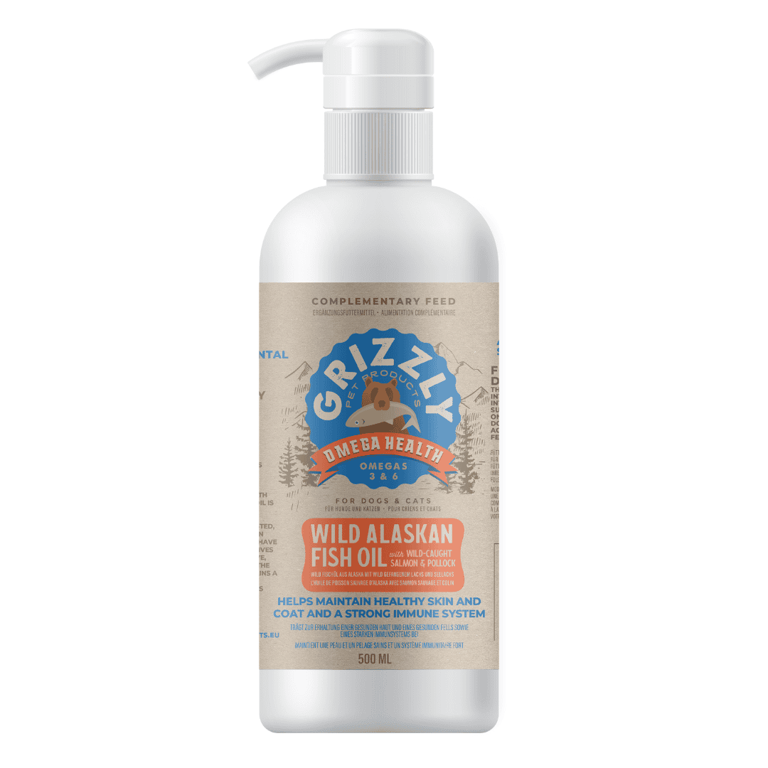 Grizzly Omega Health er en fin, ren fiskeolie udvundet i Alaska udelukkende fra bæredygtig fangst af vildlaks og sej. Fodertilskuddet kan bruges til hunde og katte til pleje og næring af deres hud, pels og kløer.