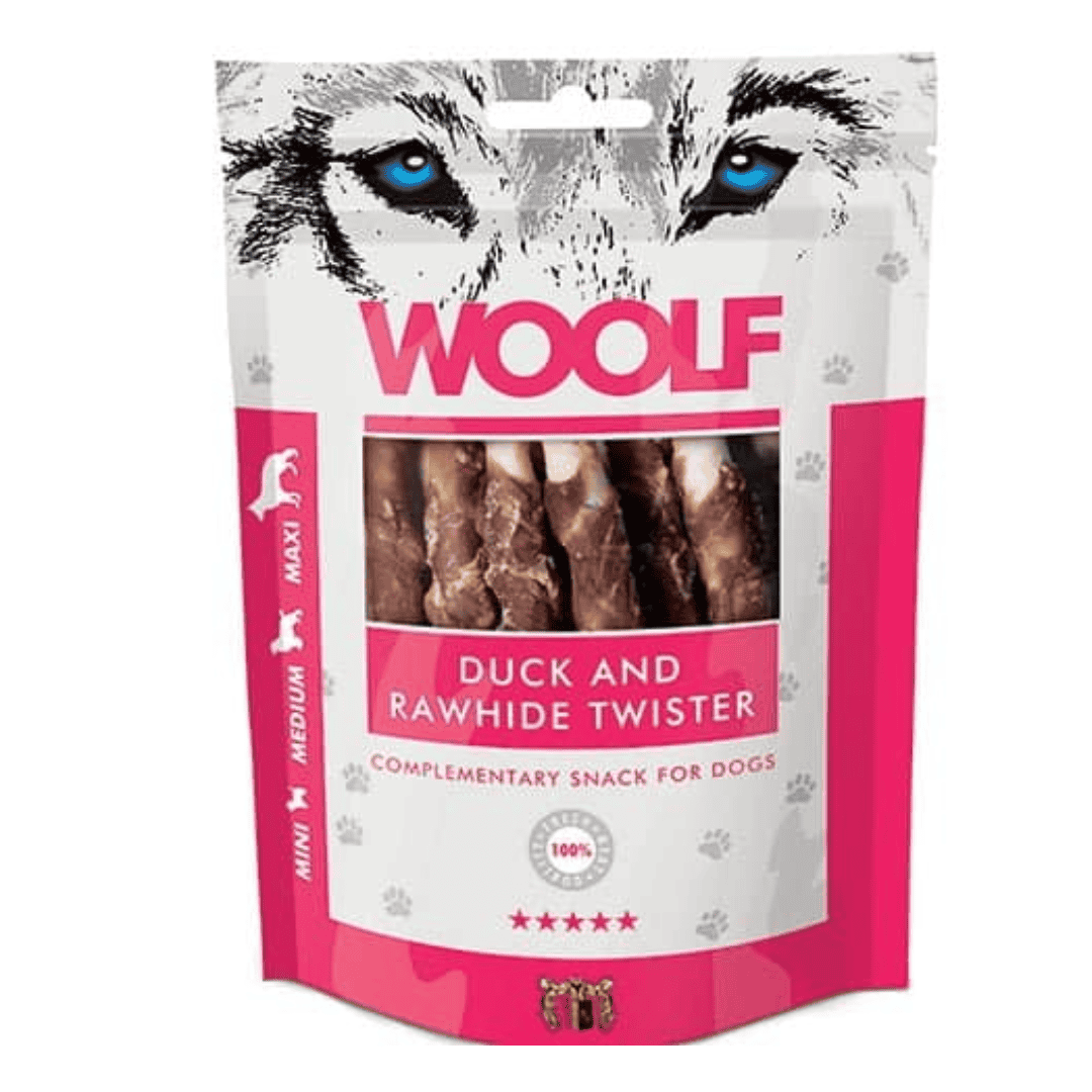 Woolf Duck And Rawhide Twister er en lille blød godbid der er lavet med 57% and. Godbidderne er uden tilsat salt, kunstige tilsætningsstoffer, konserveringsmidler eller farvestoffer.