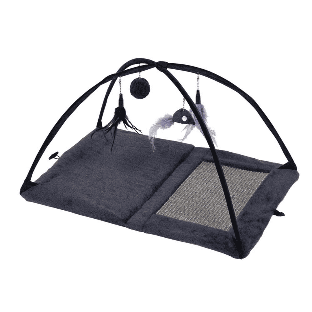 Foldbar kattelegeplads med 4 forskellige legetøjsmuligheder, kradseområde med sisal og catnip til at tilskynde katten til at lege. Måler 60 x 40 x 33 cm.