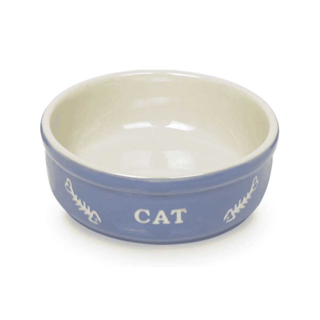 En smuk lyseblå/beige keramikskål med fiskeaftryk og teksten ‘cat’ er velegnet som både mad- og vandskål.