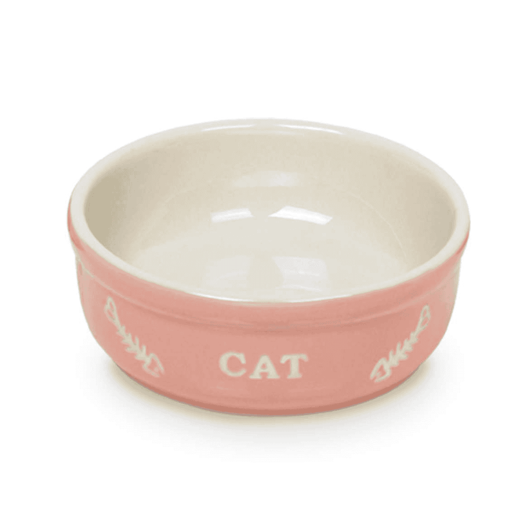 En smuk lyserød/beige keramikskål med fiskeaftryk og teksten ‘cat’ er velegnet som både mad- og vandskål.