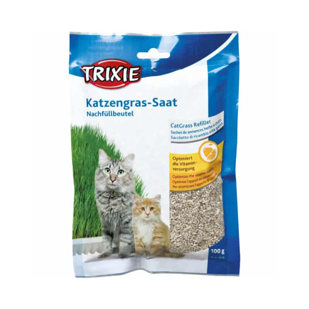 Trixie kattegræs Fin til såning i dit hjem, så du kan gro din egen kattegræs! Fordi kattehår er svært at fordøje, og kan have en tendens til at ophobe sig under normal pelspleje, kan mange katte udvikle hårboller. Fritgående katte spiser ofte græs i naturen, som hjælp til at stimulere opstød. For stuekatte kan græs derfor sørge for vitaminer, mineraler og fibre, der kan hjælpe i en normal fordøjelsesproces. De fleste katte elsker at spise græs, og det kan bringe din stuekat tættere på dens natur!